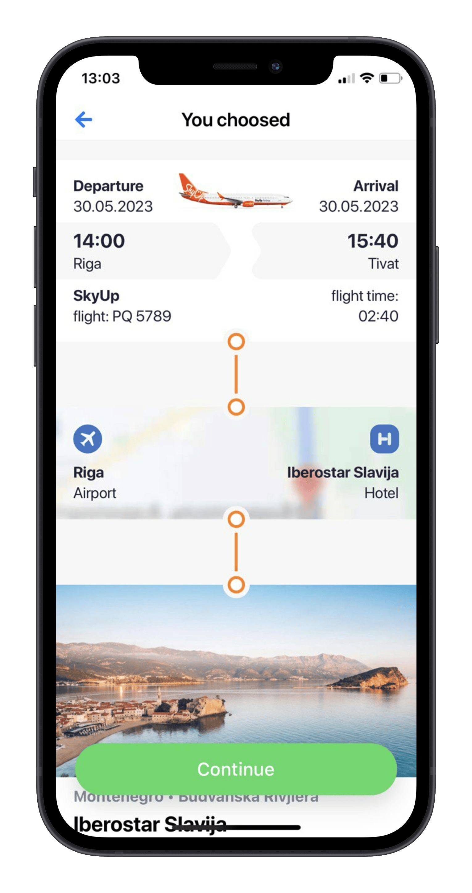 Basic information about hotel, flight and transfer.