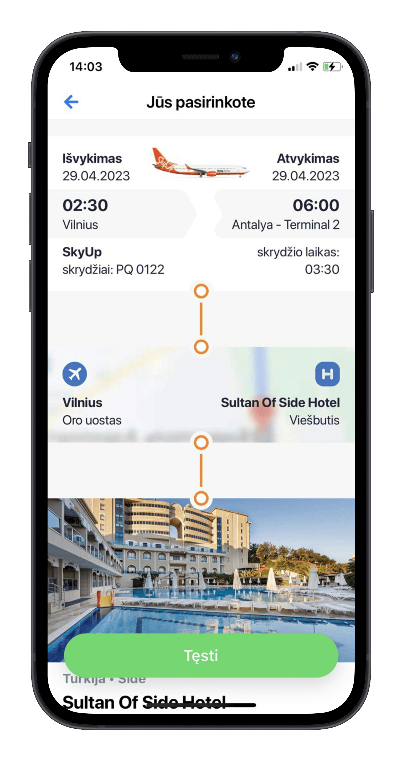 Pagrindinė informacija apie viešbutį, skrydį ir pervežimą.