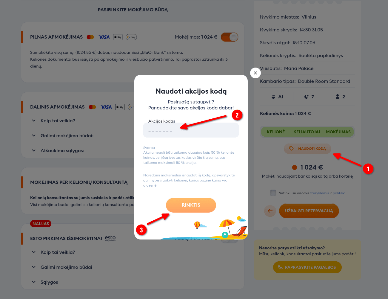 - Dovanos kodas taikomas tik kelionių paketams ir negalioja atskirai užsakant apgyvendinimą ar skrydžio bilietus.
